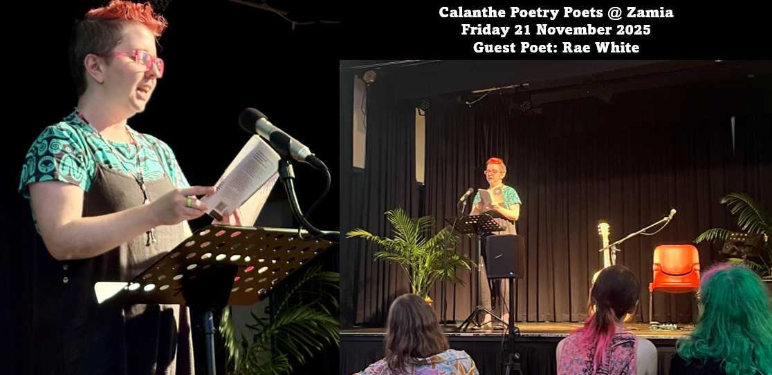 Pop-up poetry events 2016-2020: Calanthe Collective’s first poetry night was July 2016 with Anthony Lawrence, at Clancy’s Irish Bar and Restaurant. Subsequent guest poets have been: Raymond Curtis, Heather Shearer (three times), TJ Wilkshire, Geoff Sharp, Jena Woodhouse (twice), Chloe Callistemon, Jane Frank (twice), Eluned Lloyd, Laura Jan Shore, Vanessa Page (twice), Bronwyn Lea, Pat Moss, Nicki Cassimatis, Emma Simington and Maddy Dale.